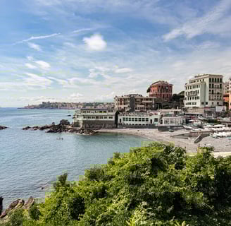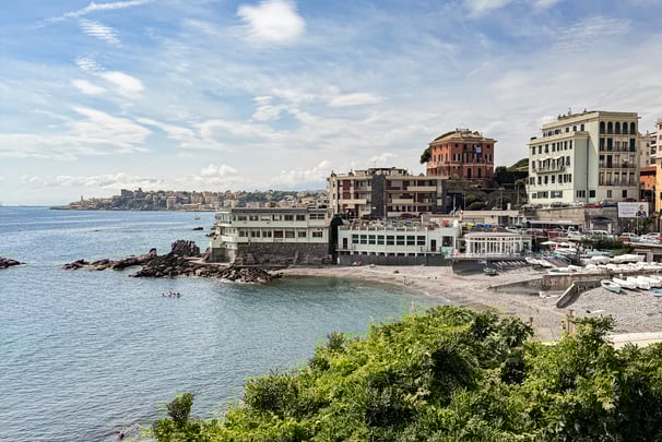 En fin de journĂ©e, nous atteignons la banlieue de GĂȘnes, en bord de mer. ApĂ©ro les pieds dans lâeau avec un Hugo bien frais, ambiance dolce vita.