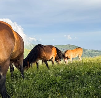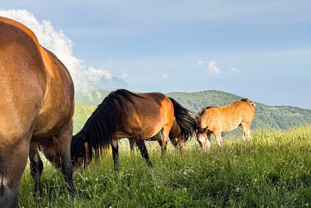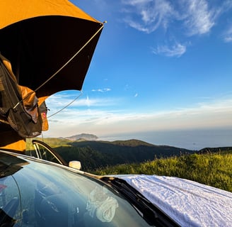 Le soir, direction les hauteurs de GĂȘnes. On monte la tente de toit au milieu de chevaux sauvages, avec une vue Ă couper le souffle sur la ville illuminĂ©e. Câest un de ces moments suspendus quâon nâoublie pas.